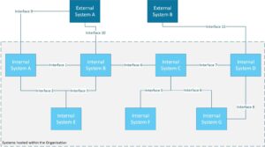 The enterprise architecture can be simplistically envisaged as shown in the diagram above, where there are several internal and external systems with different interfaces between them. Each of these interfaces will need to be understood by the organisation and then maintained and monitored to make sure they are behaving correctly. Note how the number of interfaces can grow quickly as the number of systems grows, especially if each new system supports multiple interfaces. Understanding and maintaining these interfaces is a cost to the organisation; minimising their impact can result in a significant reduction in OPEX.